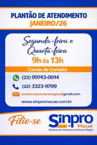 Professor (a), a direção do Sinpro Macaé e Região realizará o atendimento por via de plantão presencial neste mês de janeiro. Os telefones estão disponíveis da sede Rio das Ostras (22) 3323-9799 e Whatsapp