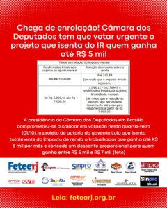 Leia mais em nosso site: https://feteerj.org.br/chega-de-enrolacao-camara-dos-deputados-tem-que-votar-urgente-o-projeto-que-isenta-do-ir-quem-ganha-ate-r-5-mil/