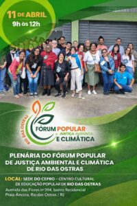 Moradores de Rio das Ostras estão convocados para a plenária do Fórum Popular de Justiça Ambiental e Climática, que será realizada no dia 11 de abril, das 9h às 12h, na sede do CEPRO, na Avenida das Flores, nº 394, no bairro Residencial Praia Âncora.