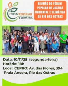 No próximo dia 10/11/25, às 18h, na Sede do Cepro, faremos uma reunião para discutir os avanços e desafios na implementação da Carta Compromisso do Fórum Popular de Justiça Ambiental e Climática de Rio das Ostras.