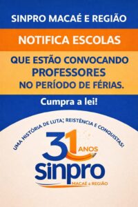 O SINPRO Macaé e Região alerta que convocar professores durante o período de férias é prática irregular e fere a legislação vigente. As férias são um direito garantido e devem ser respeitadas integralmente pelas instituições de ensino.