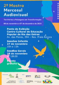 A 2ª Mostra Mercosul Audiovisual, promovida pelo ponto de Cultura Cepro – Centro Cultural de Educação Popular acontece em Rio das Ostras com sessões nos dias 27 e 28 de novembro. Com o tema “Territórios e Paisagens em Transformação”, esta edição reúne produções de seis países do bloco e será exibida em dois formatos: filmes infantis, em sessões às 10h e 15h de quinta-feira, e obras para o público geral, na sexta-feira, às 18h30. Esta é a segunda vez que o Cepro participa da iniciativa, que busca estimular a circulação de conteúdos culturais e aproximar o público da produção audiovisual latino-americana por meio de exibições gratuitas.