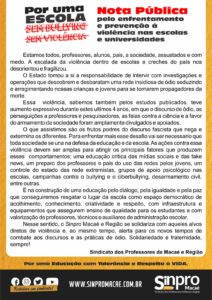 O sindicato destaca que o enfrentamento ao bullying deve ir além de ações pontuais, exigindo políticas públicas consistentes, formação continuada de educadores e o fortalecimento de redes de proteção nas escolas. A campanha também reforça a importância da escuta ativa, do acolhimento às vítimas e da construção de práticas pedagógicas voltadas à cultura de paz.
